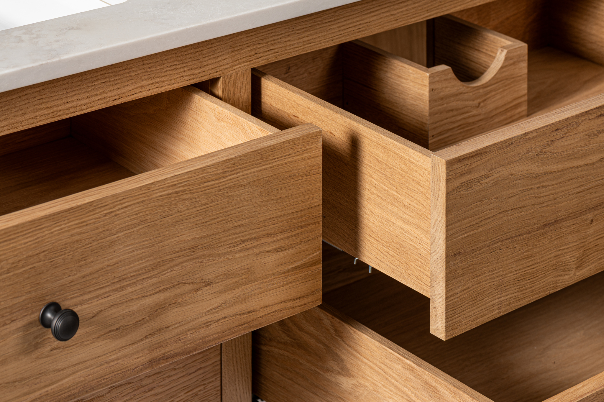 Absolutely. All of our vanity units are designed with usability in mind, featuring soft-close hardwood drawers for smooth, quiet operation. Unlike many standard units, our designs ensure that even the top drawers remain fully functional, providing practical storage solutions without compromising on style.